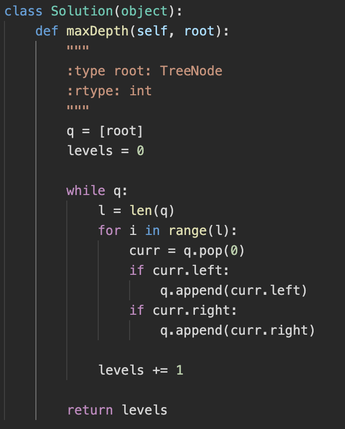 Let's say q is the queue, levels is a pointer to point the depth of tree.