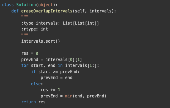 Else, it is overlapping, so that we count them as 1. And update prevEnd.