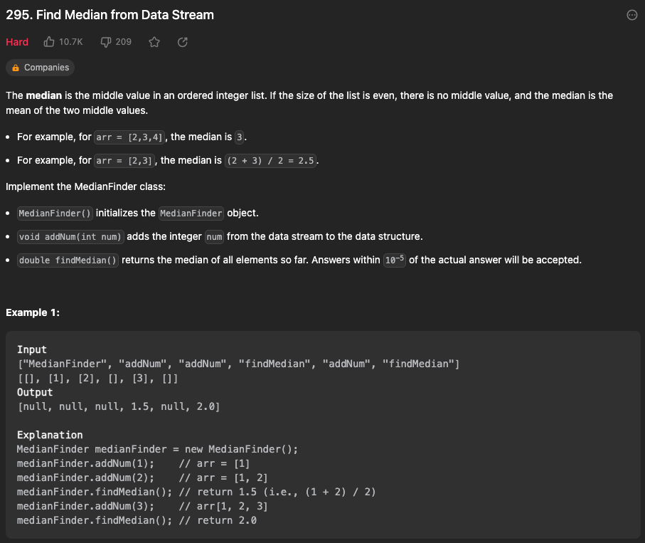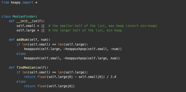 3. add(7): Add to small heap[O(logn)], 7 is bigger than 3, so find the max[O(1)], move to large heap[O(logn)]