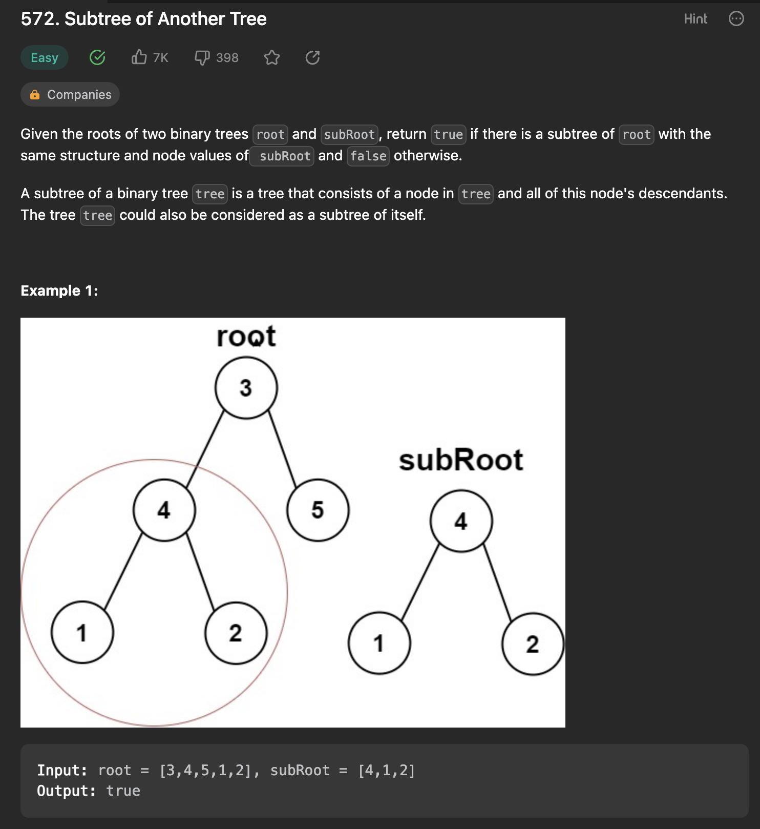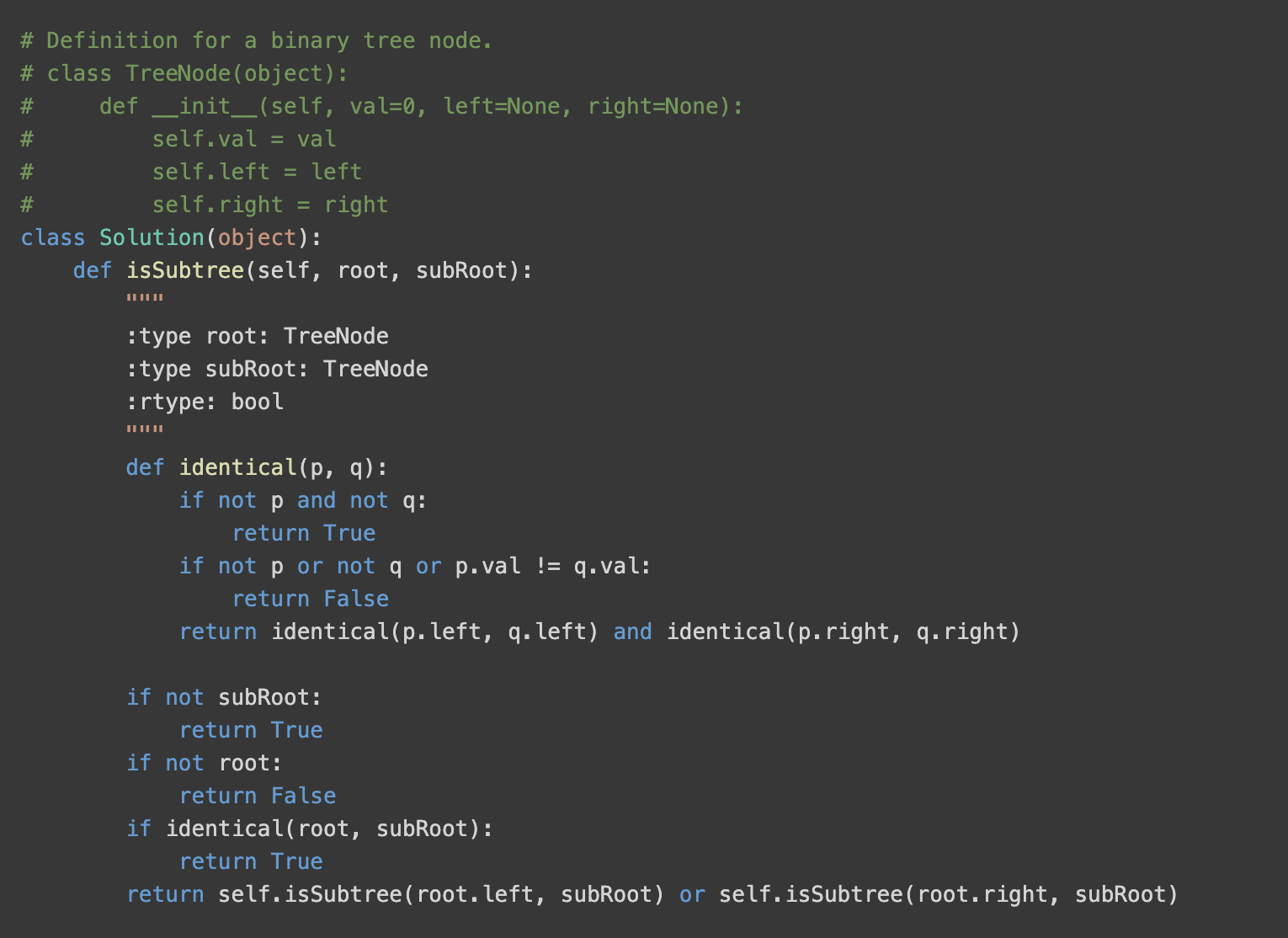 We check if the current node in the tree is where our subTree is rooted at. If yes, we return True.