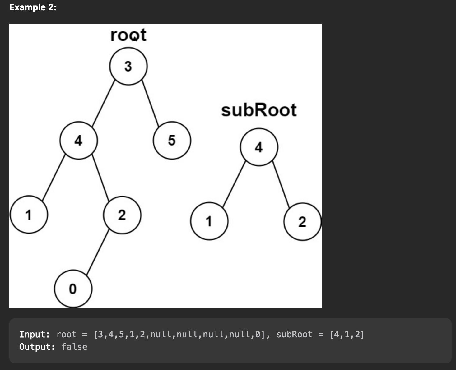 However, in example 2, it returns False because subRoot has unexpected child node.