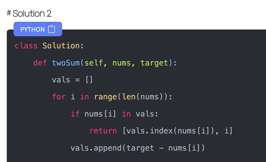 Let's say the Target - nums[i] is a nums[x]. nums[x] would be an another interger we should find. Using example 1, the first value of vals is 7. Before putting second value (which is 9 - 7 = 2), 7 is already in the vals. Therefore, the array[0] and array[1] would be the two sum of intergers we tried to find.