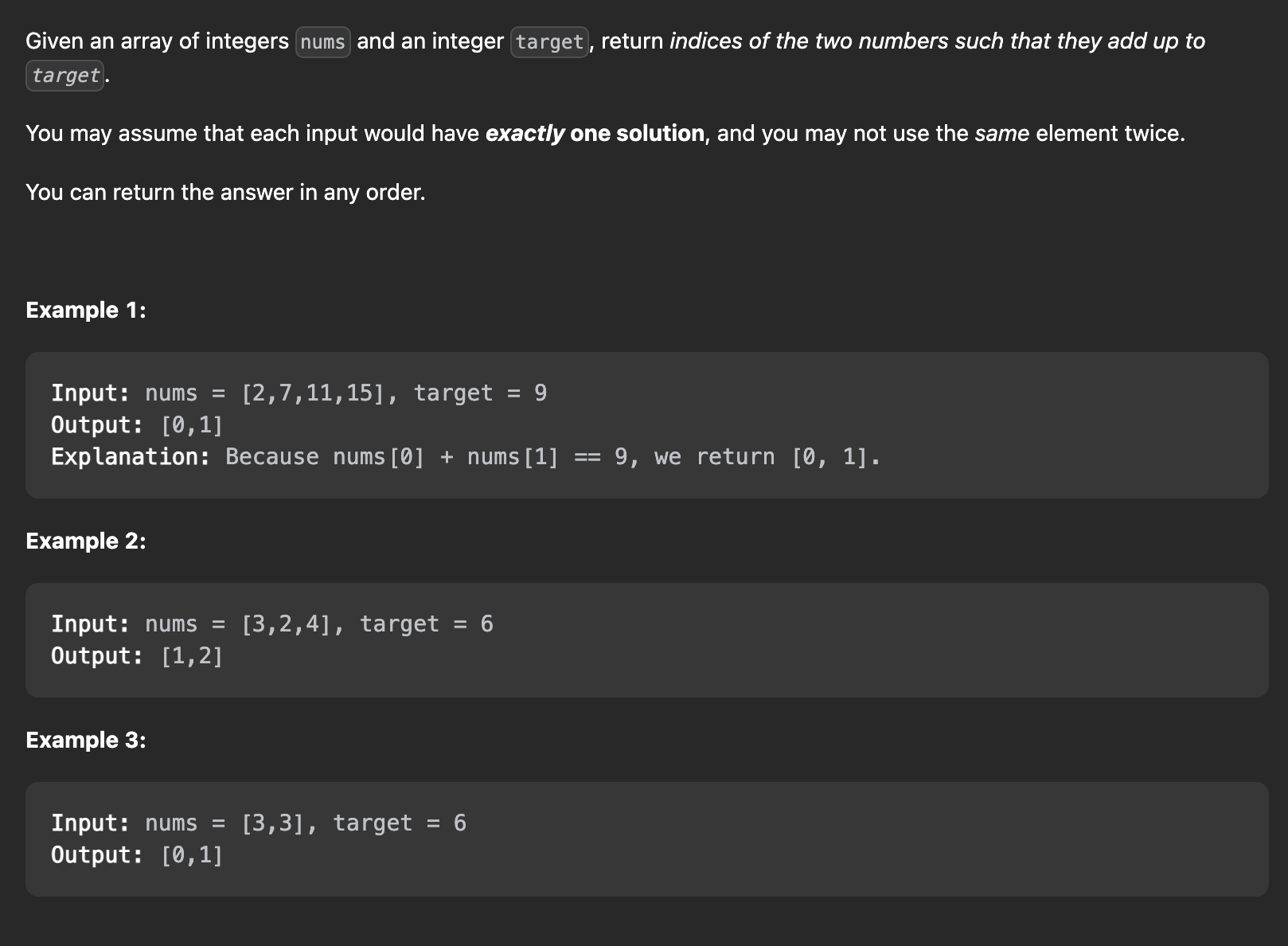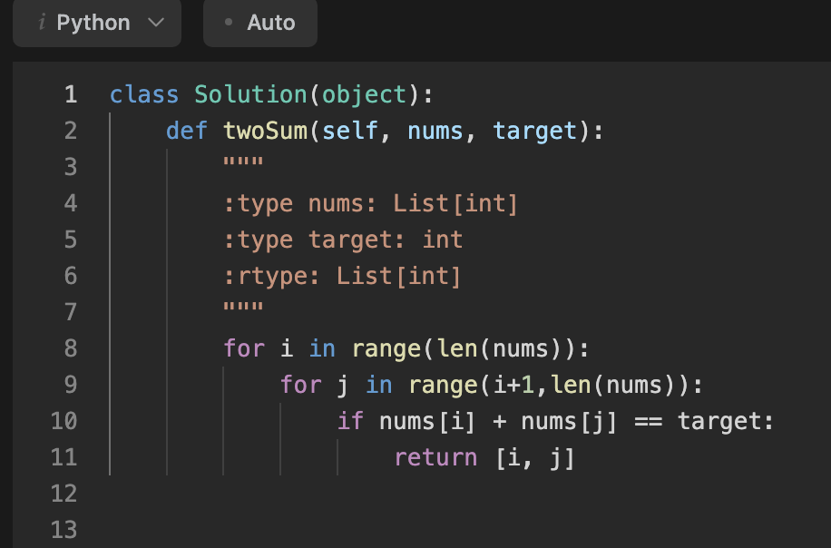 When I looked into the each variables, I used nested loop(two for loop) to find out the two variables in the array. And if the sum of two variables equal to the value of target, I return the i and j as a dictionary.