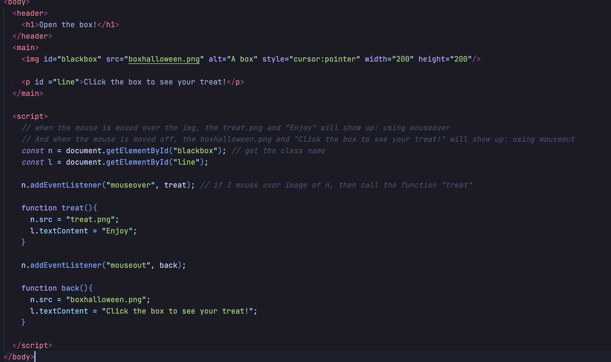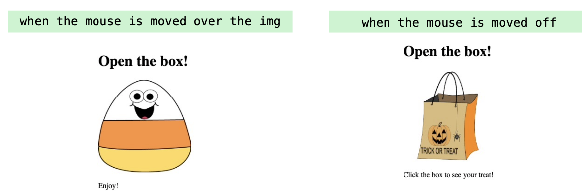 The triggered event is treat(). In treat() function, we change the image source to other image and change the text content below the image.