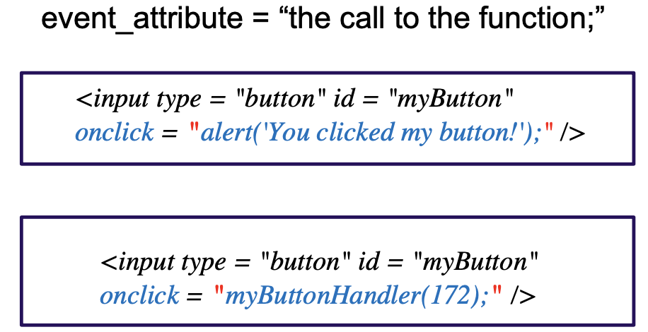 There is something called "DOM 0 Model" in Javascript. This uses event tag attribute!