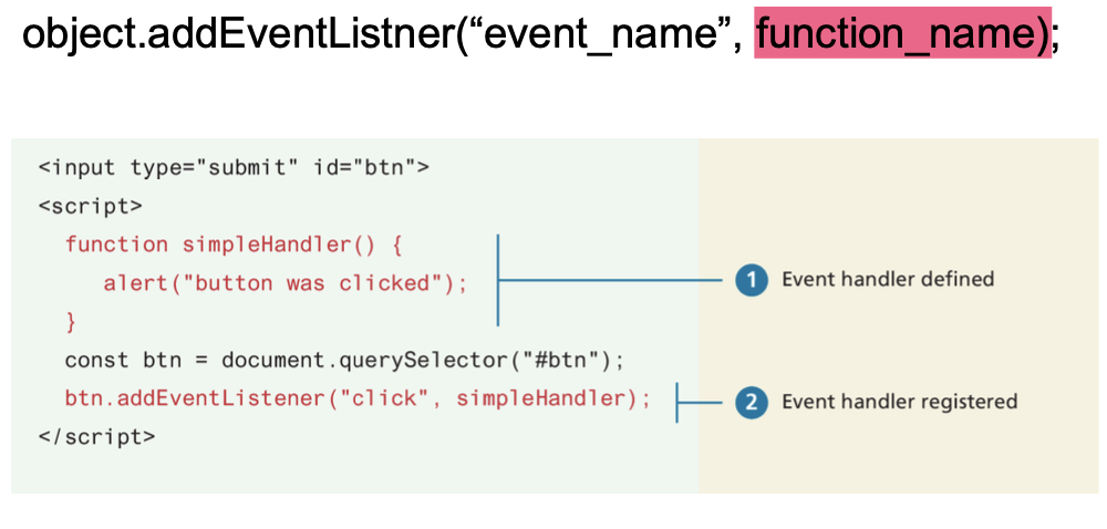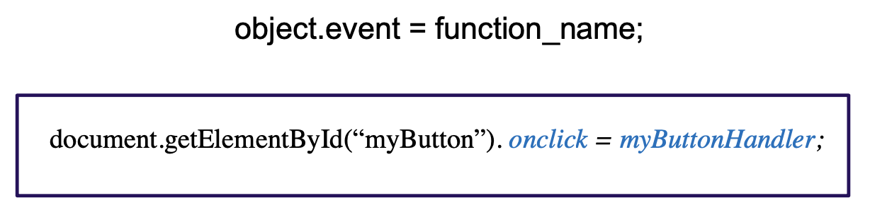 This one is very basic event handler in Javascript. Here is another using function name to the associated event property on the object.