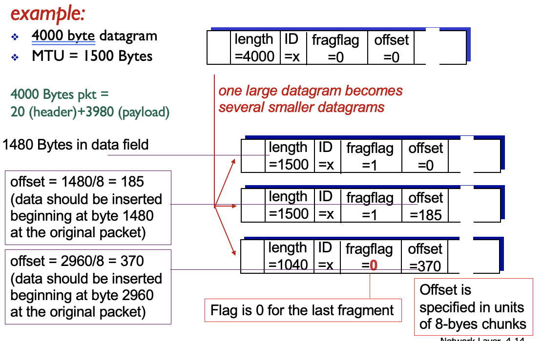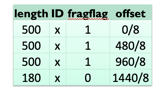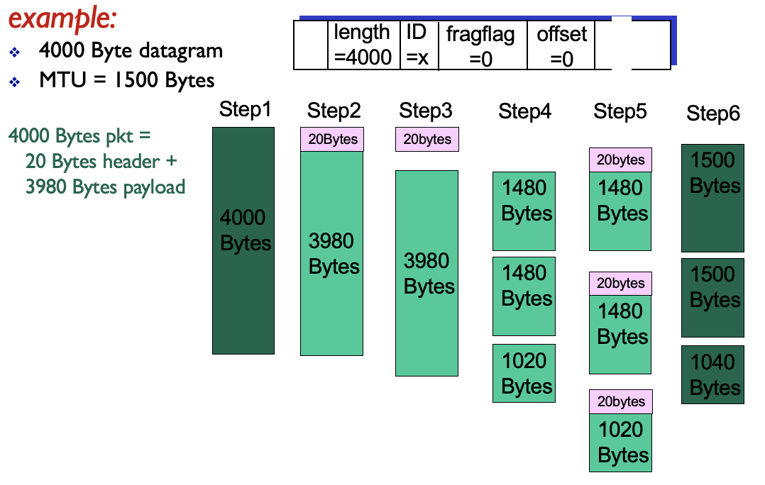 Example: 1600 byte datagram, MTU = 500 bytes.