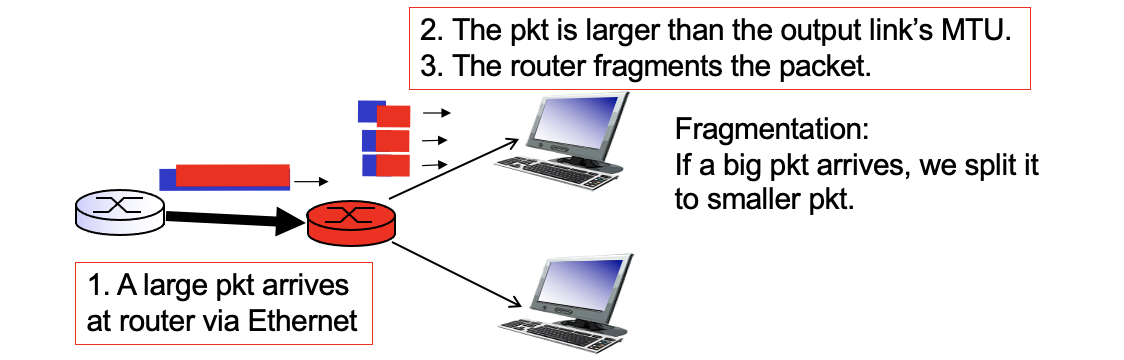 So, our network usually have MTU (Max Transimission Unit): maximum amount of data that a link-layer frame can carry (max size of an IP packet). Different data link protocols (like Ethernet, WiFi) have different MTUs.