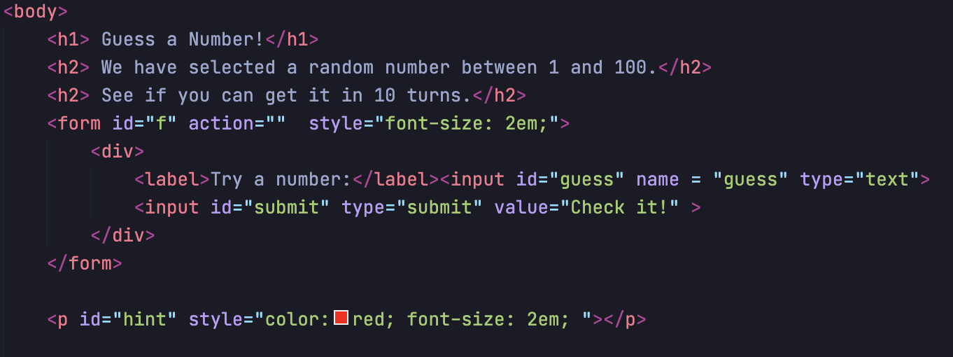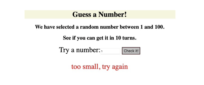 I make the "Guess a Number" game. Every page has a random number between 1 and 100. If we submit smaller number, then we show the message "too small, try again." If we submit bigger number, then we show the message "too large, try again."