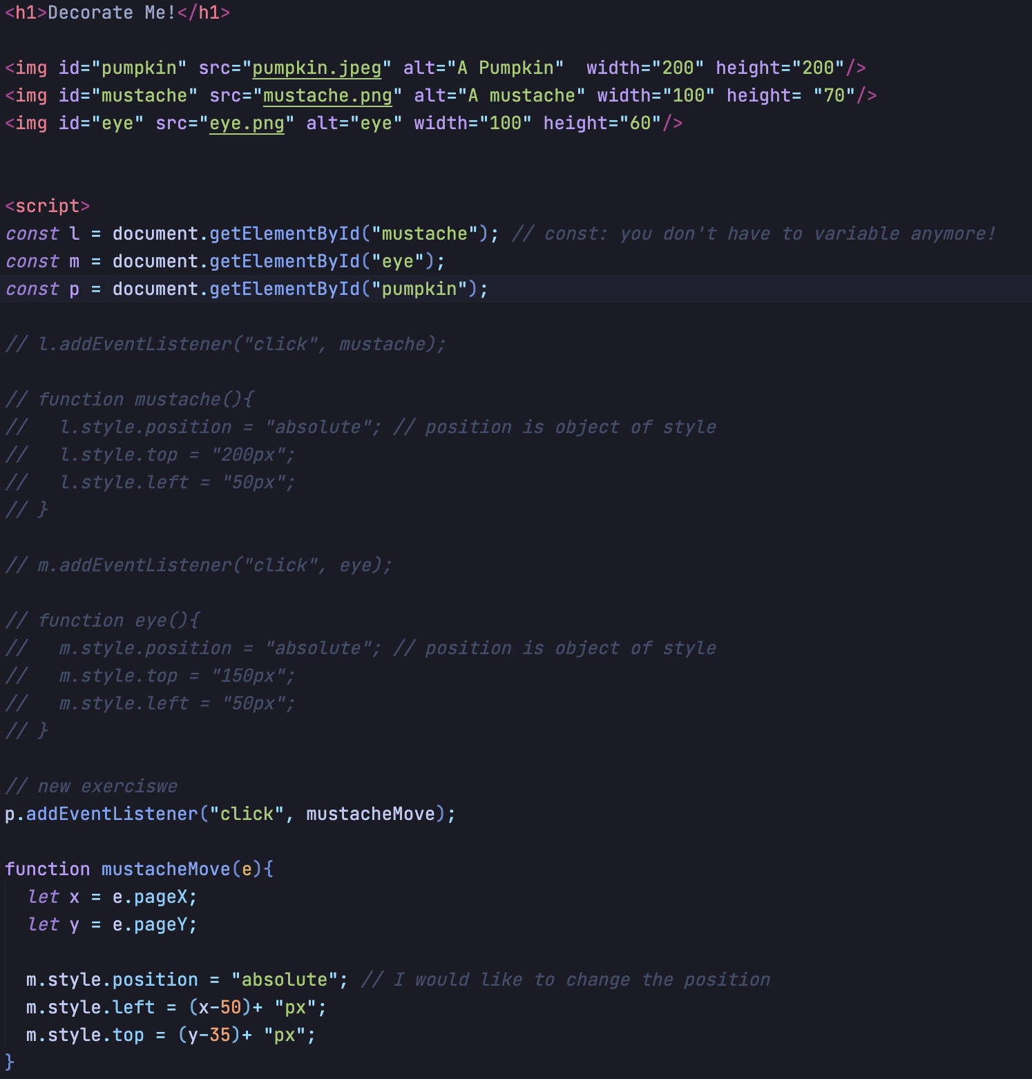 p.addEventListener("click", mustacheMove); --> If I click on the pumpkin image, then it triggers the mustacheMove() function.