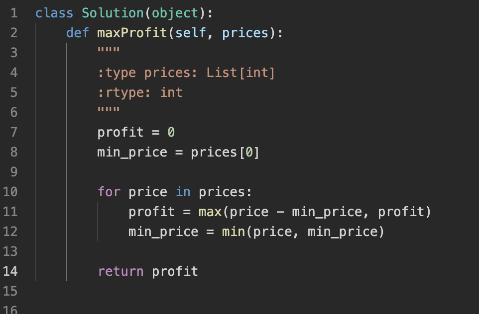 This code is not nested loop, so it is not gonna be O(N^2). Just O(N) time complexity. What is the difference from previous brute force algorithms? I would like to say we store two array while process in loop. We stored two value called profit and minimum price.