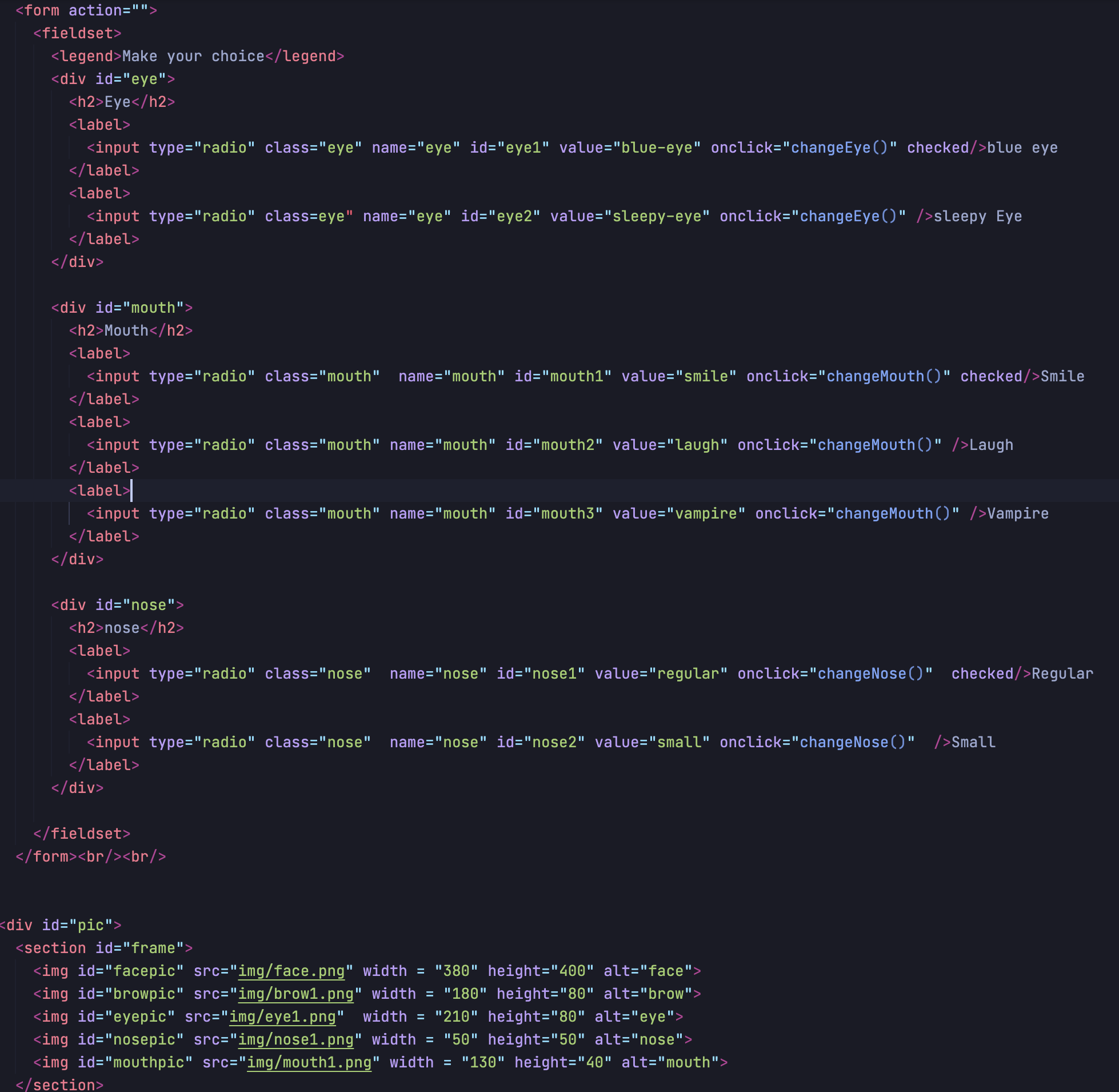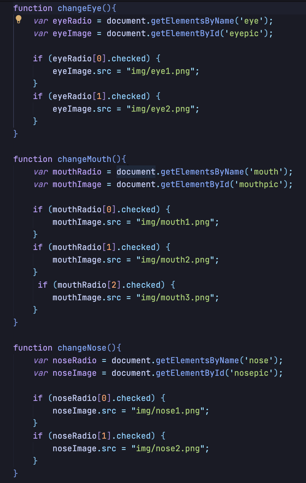 Each function has two var. "var ~Radio" is for array to get Node from html file. "var ~Image" includes the node from <img> in html.