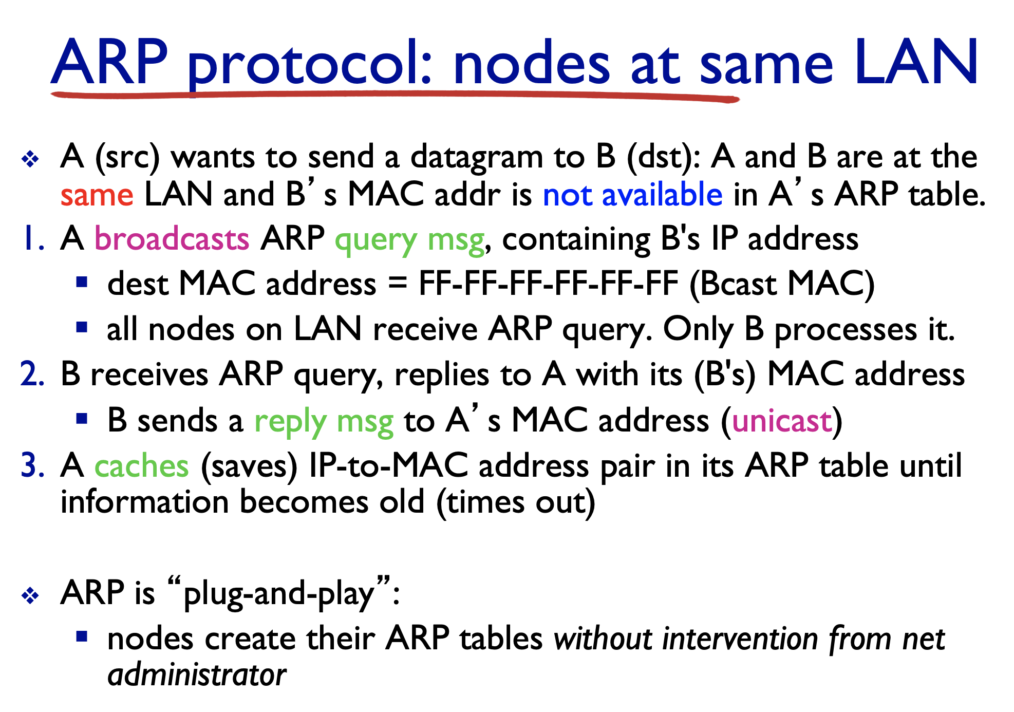 - A sends a request to find out B’s MAC address. B replies. A stores that in its ARP table. Now A attaches a link-layer header to datagram and enters B’s MAC address as destination in that header.