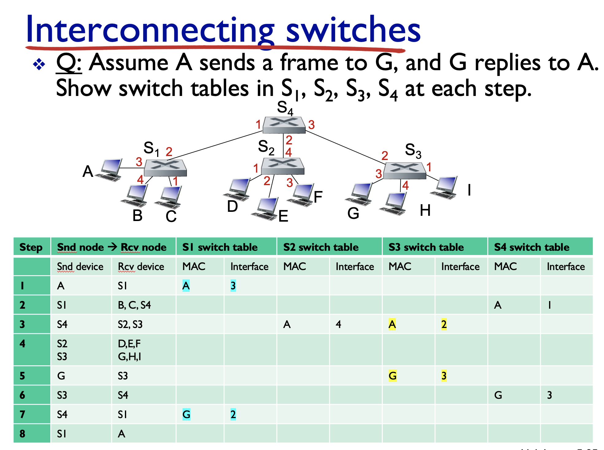 - S4 sends to S2 and S3. --> S2 and S3 knows which port they can access to A.