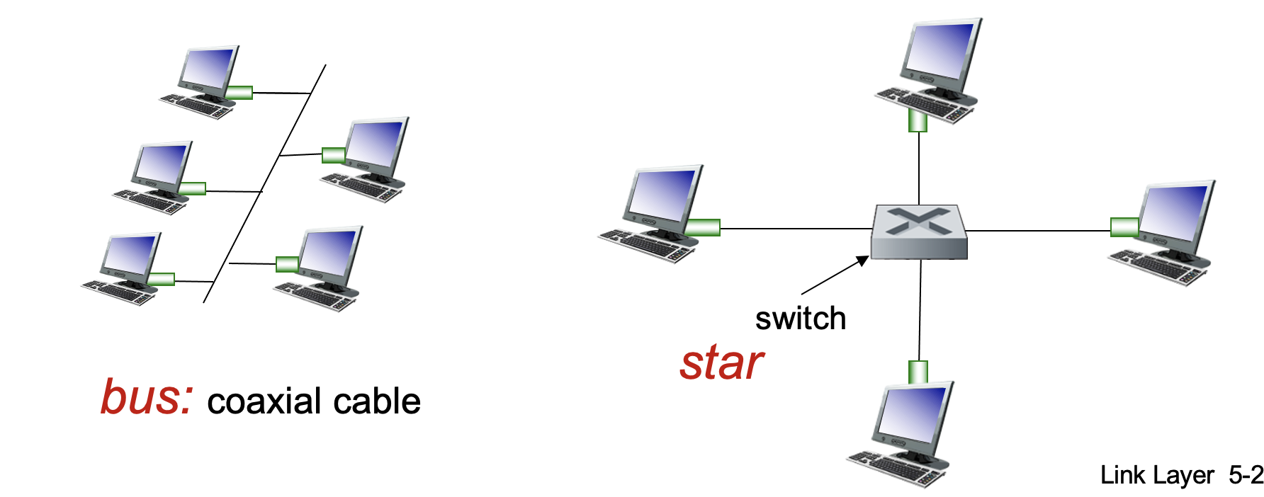 - Different physical layer media: fiber and cable.