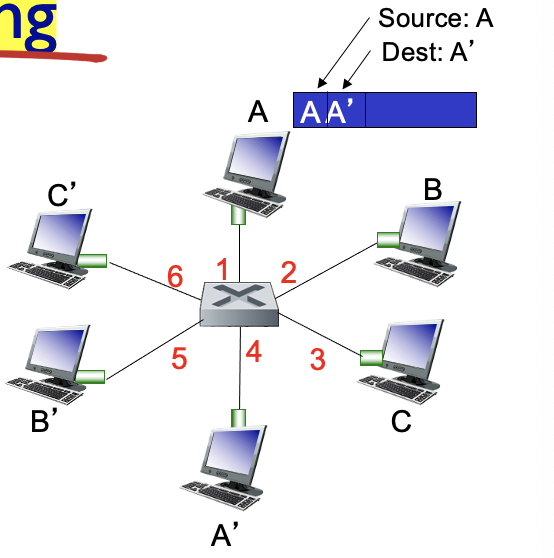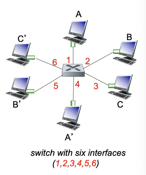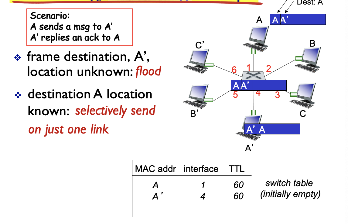 - Switches: learn forwarding table using self-learning, flooding, MAC addresses