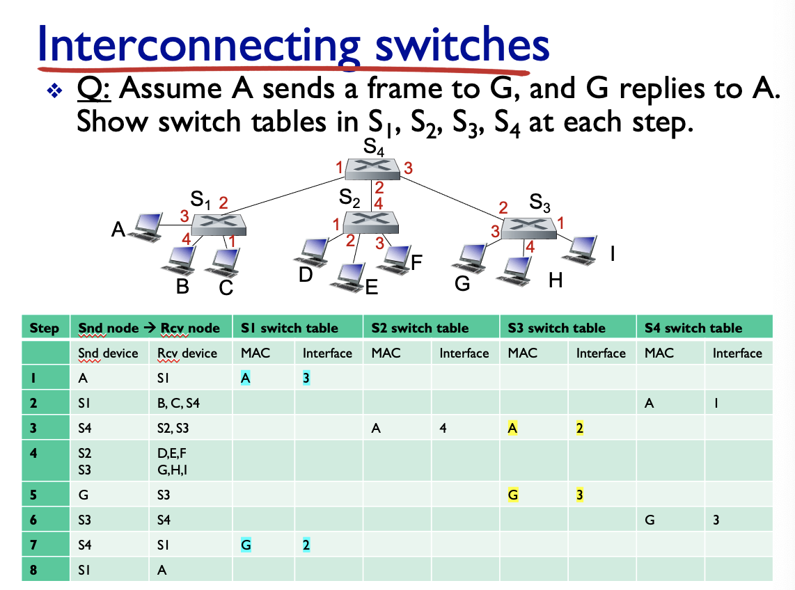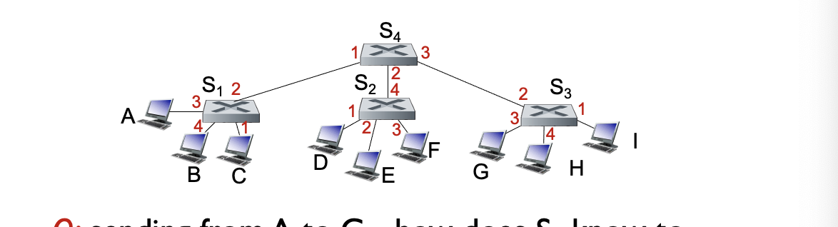 Question: sending from A to G - how does S1 know to forward frame destined to G via S1, S4 and S3?