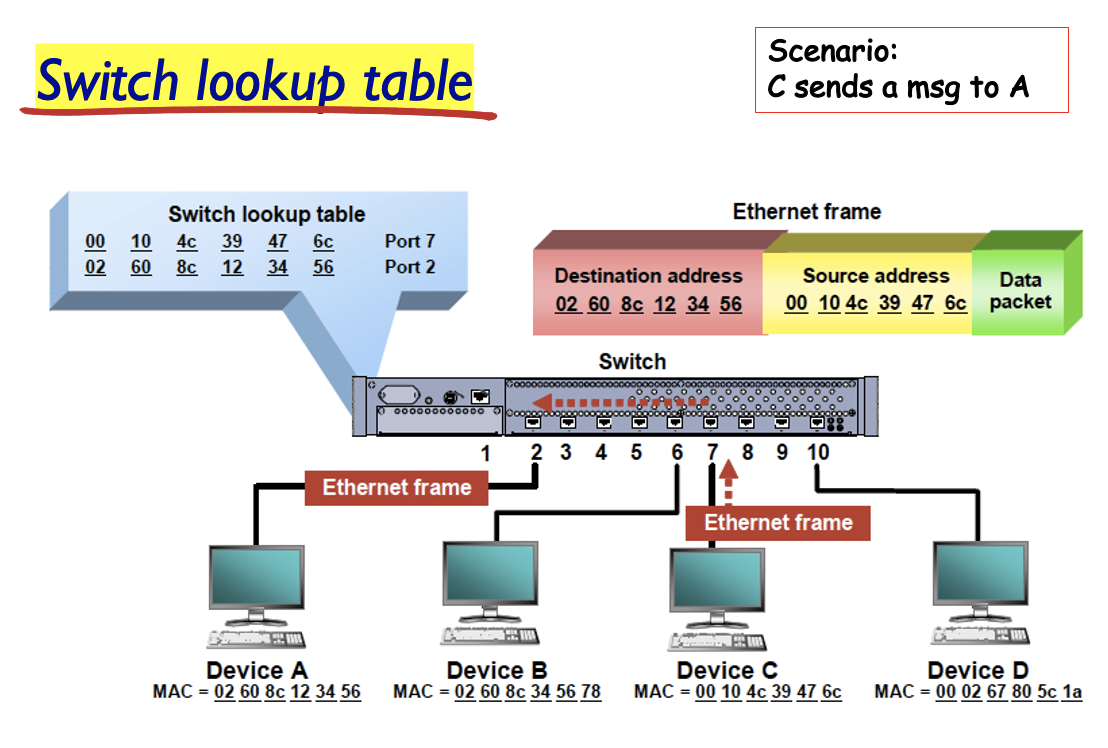 - Switch compares the frame's Destination MAC address to the switch's MAC address table.