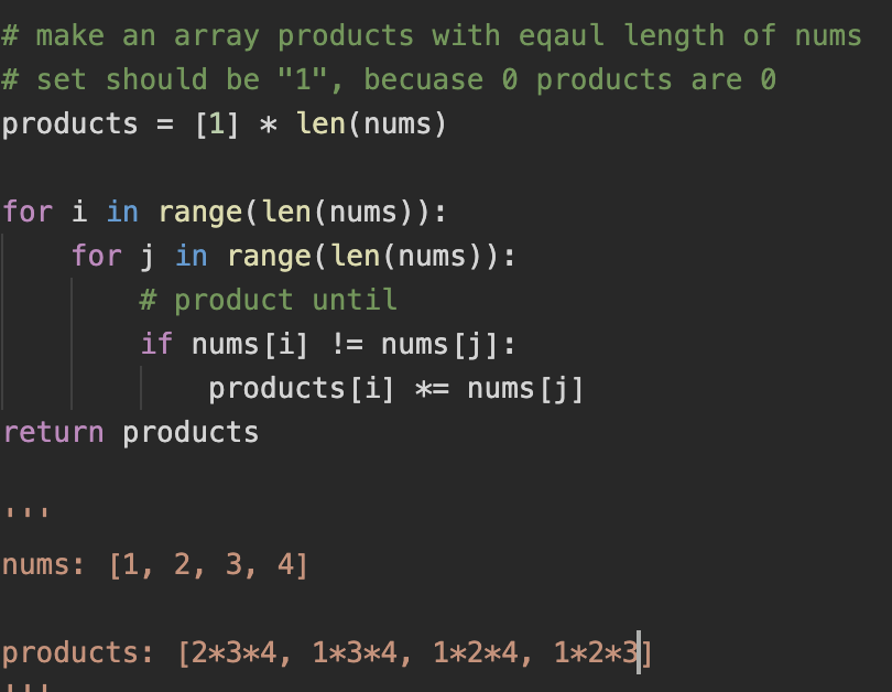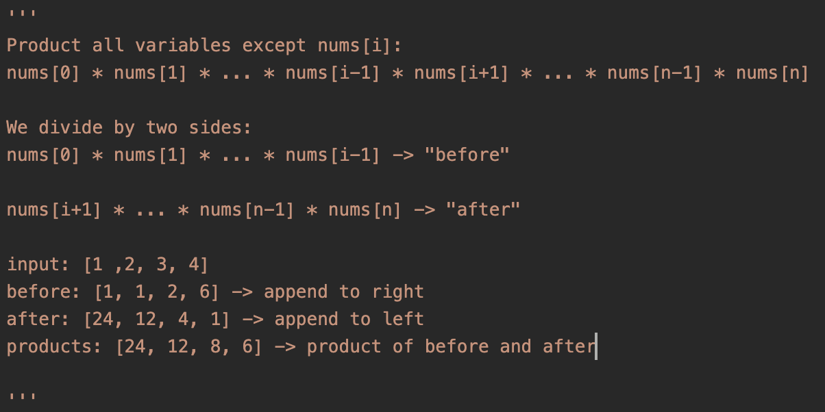 We can see that we divide by two list which are name "before and after". In the before list, we put the product of variable before nums[i], and append to right in the list. In the after list, we put the product of variable after nums[i], and append to left in the list. The thing is that the products should be initialized by "1" not "0", because 0 products any numbers is "0".