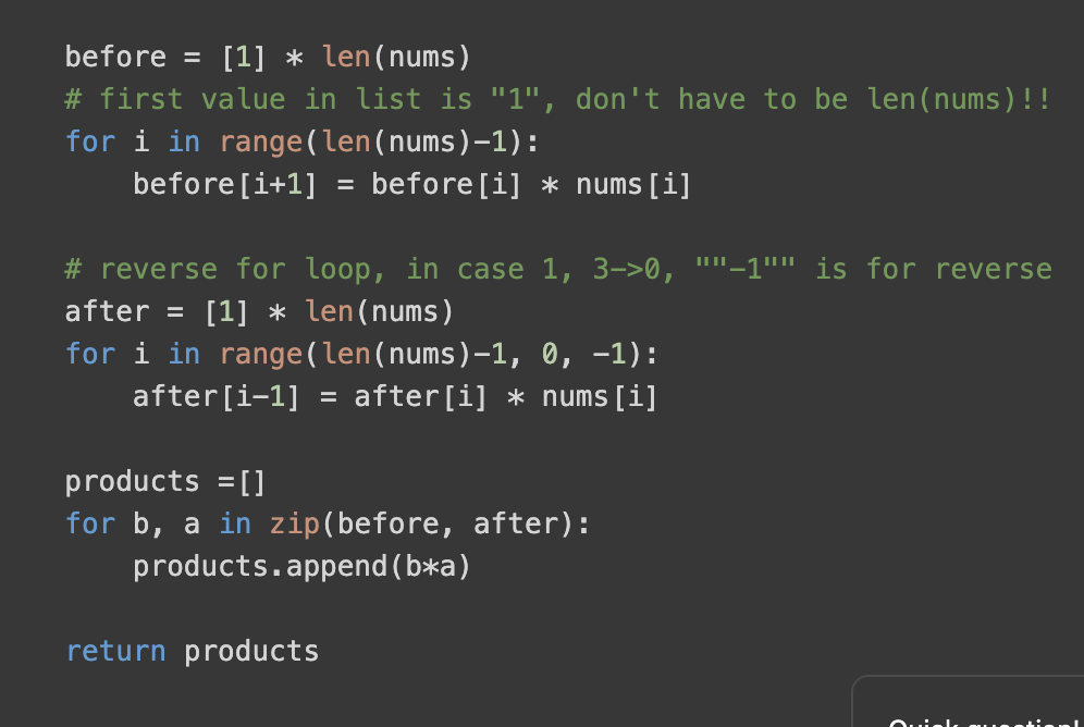 We have two list before and after. In after, we did for loop reverse. For example, [1, 2, 3, 4] and we fill the value from 3, 2, 1 (not 1, 2, 3). Append the value from right to left. The list name products, we can figure it out zip the before and after, and b & a run each list, and we append the b * a. And return products.