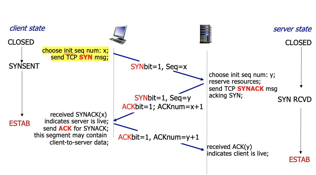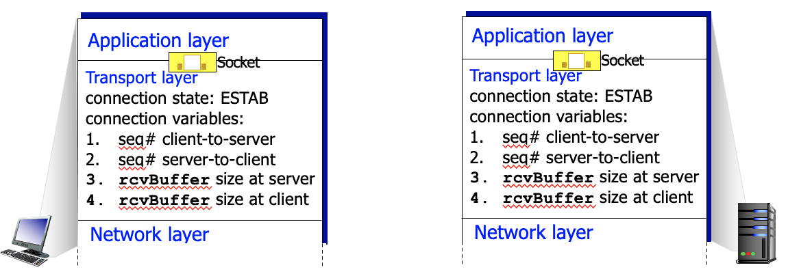 - Handshaking (exchange of control messages) inits sender, receiver state before data exchange