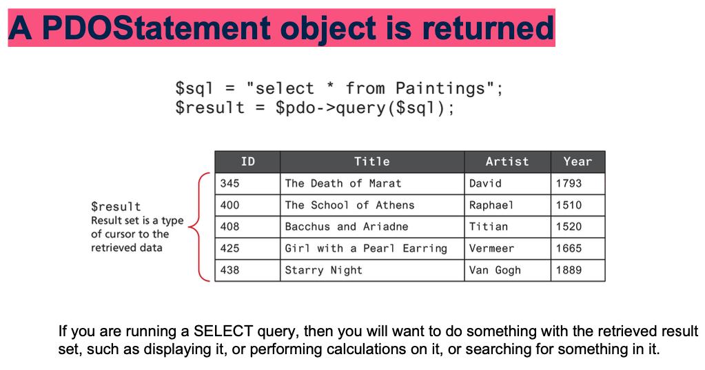 - query(): used when you expect a result set to be returned. It returns a PDOStatement object to you that you can iterate over to get the individual rows.