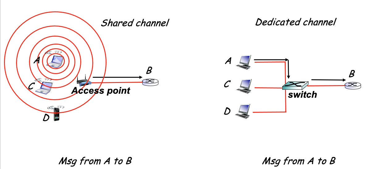 - Broadcast (shared wire or medium): multiple sender, receiver