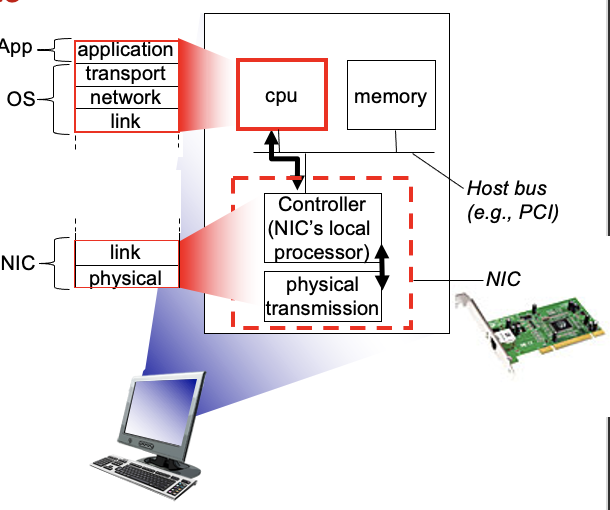 - Link layer implemented mainly in "adoptor" (aka network interface card NIC) or on a chip.