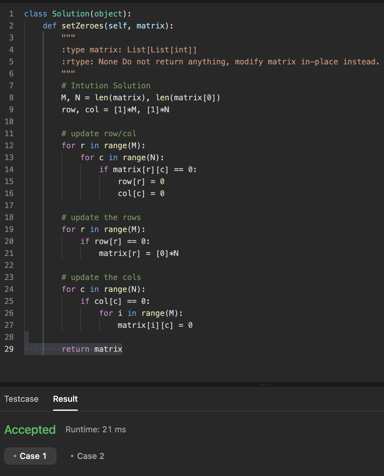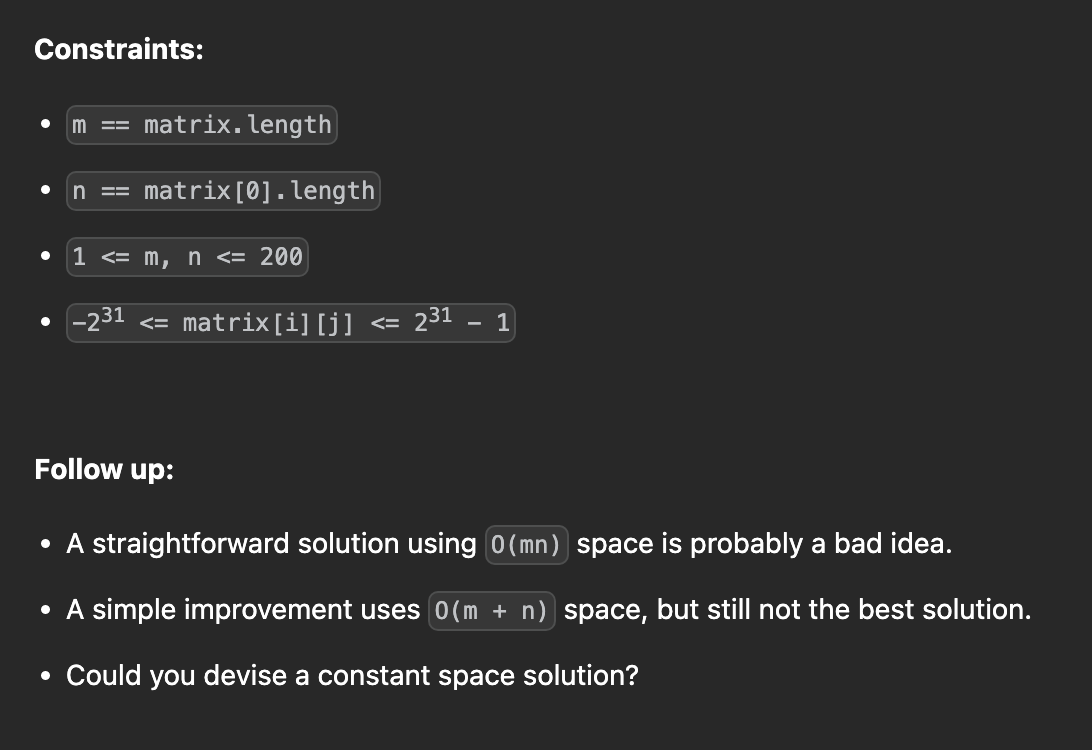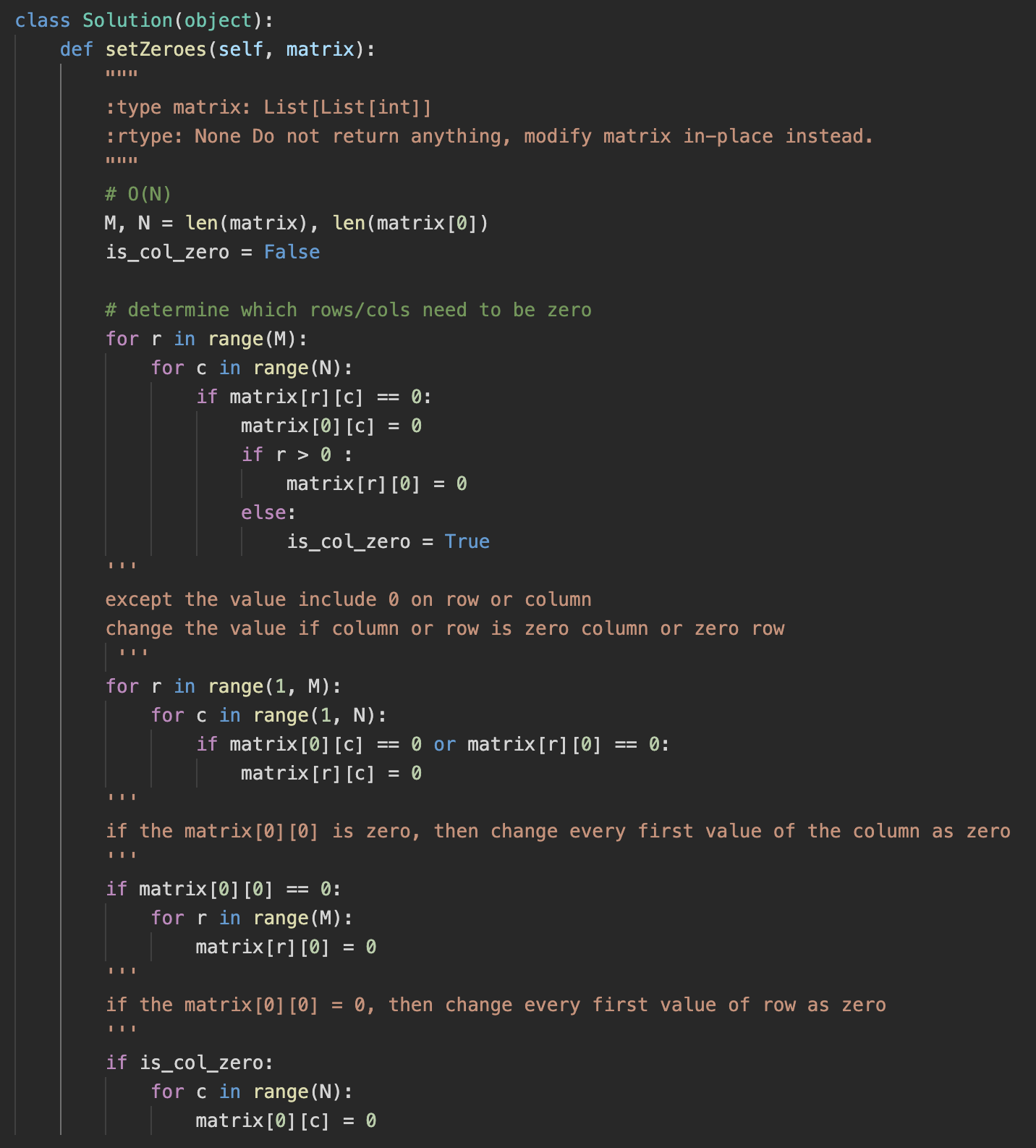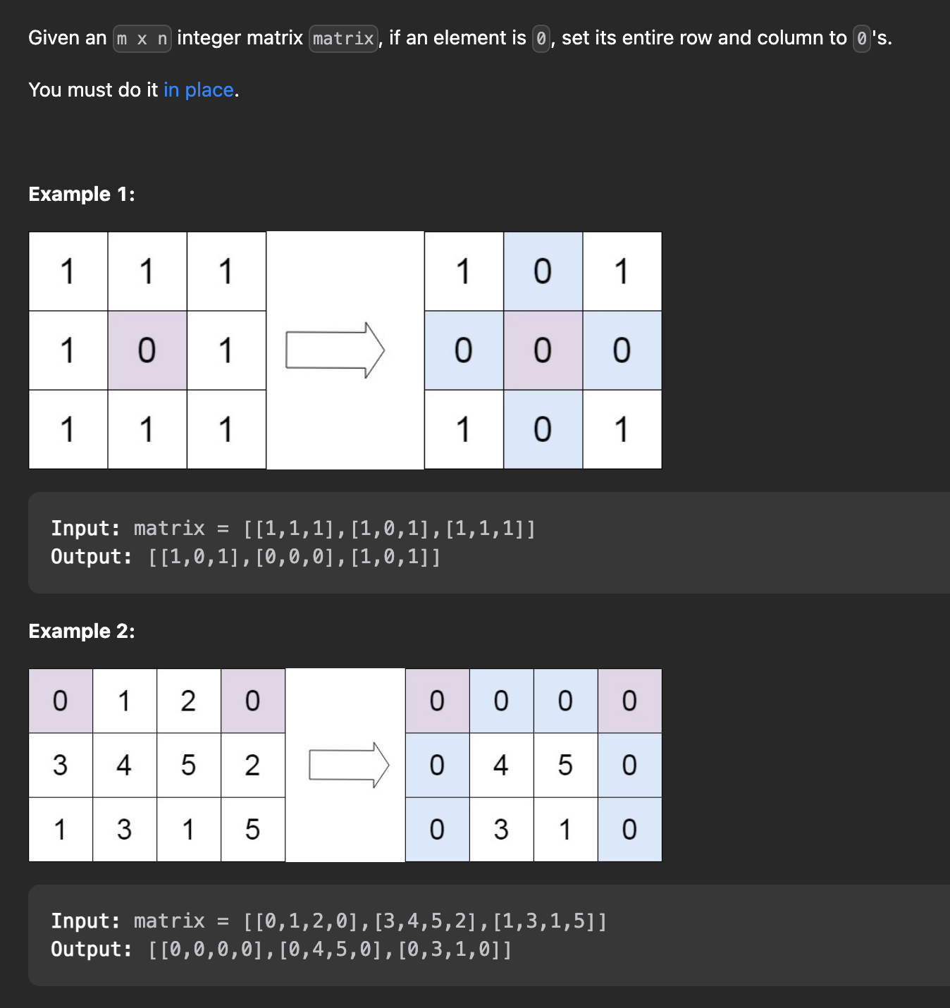 We use brute force to update the array which is not "0" row or "0" col. Otherwise, the arrays include which row and col is zero or not.