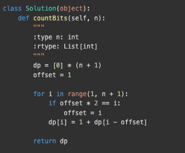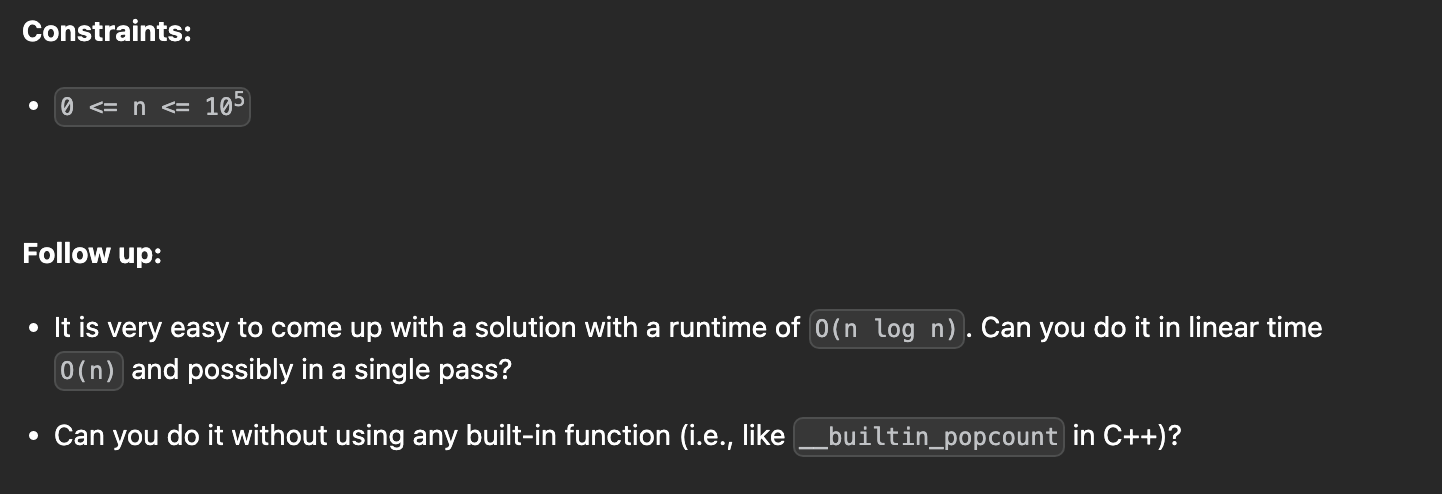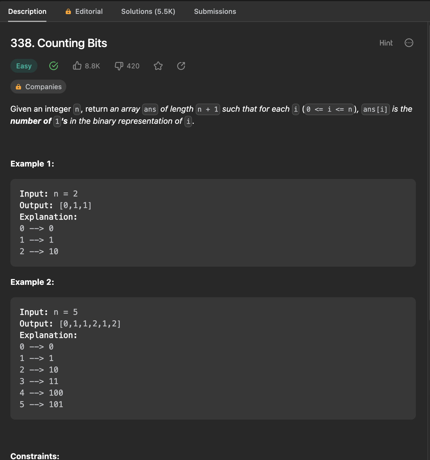 In this problem, we are gonna return the array. The array length should ne "n+1", and the array show how many 1 bits each number has in their binary number.
