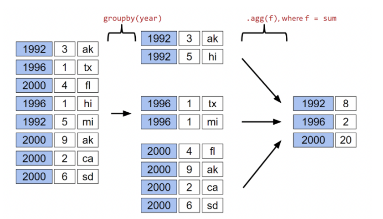 As we learned last lecture, a groupby operation involves some combination of splitting a DataFrame into grouped subframes, applying a function, and combining the results.