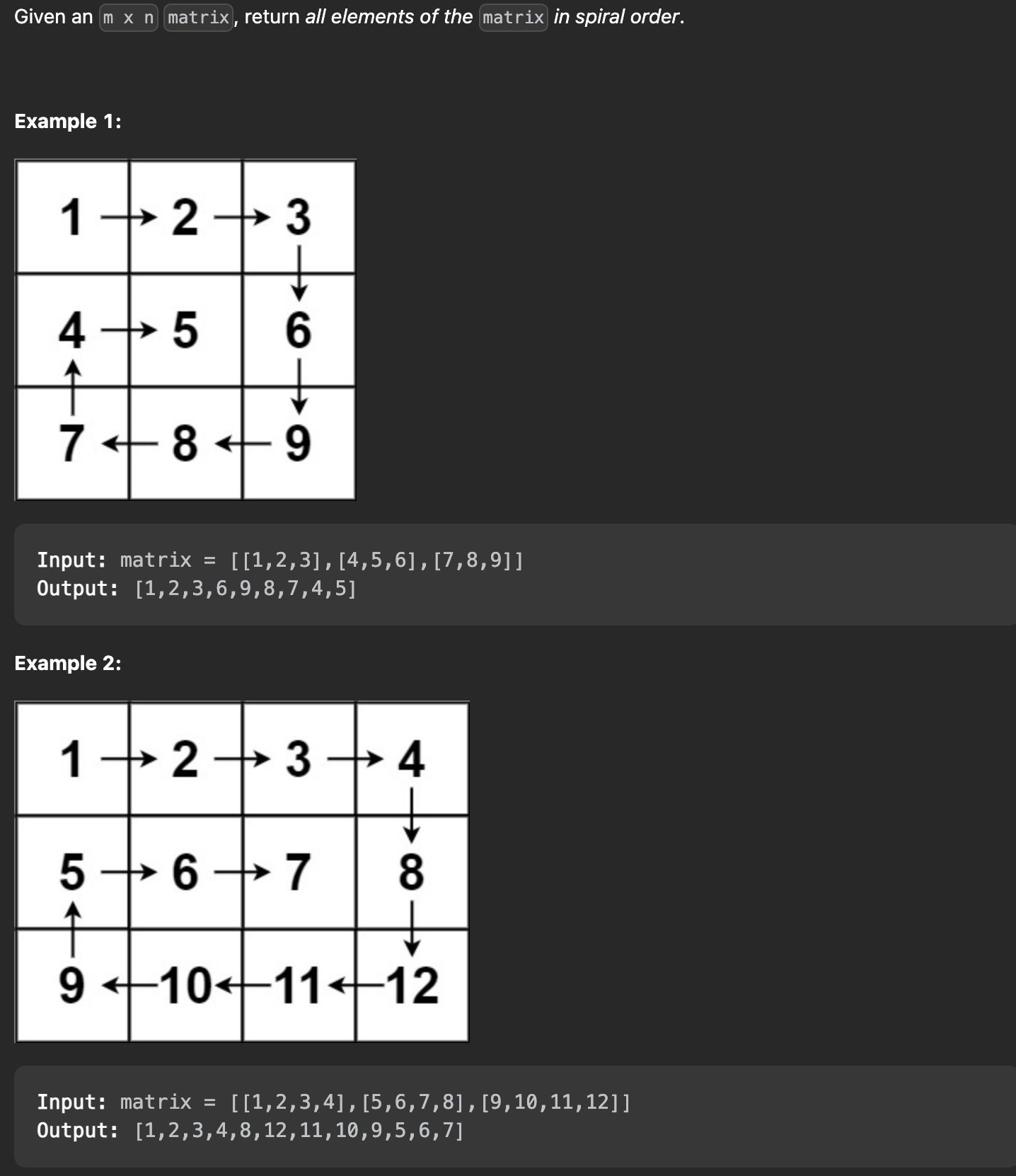 We can see the sprial matrix gets value following this order: top row --> right most column --> bottom row --> left most column.