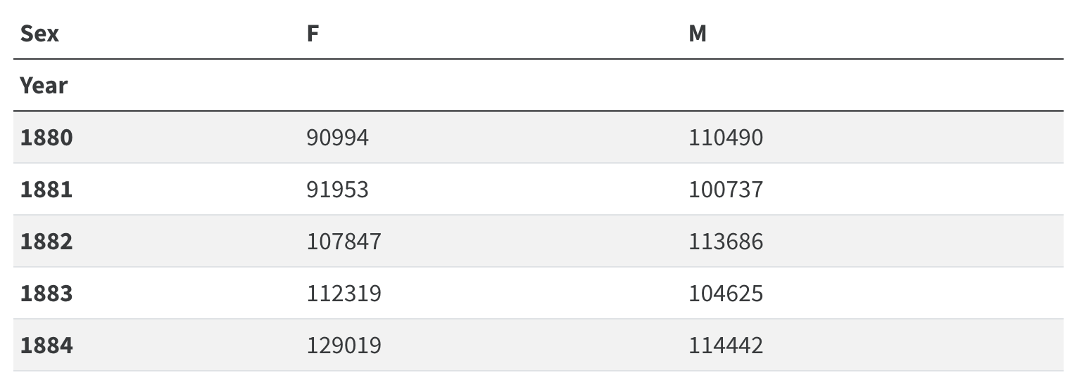 babynames.pivot_table(index = "Year", columns = "Sex", values = "Count", aggfunc = np.sum).head(5)
