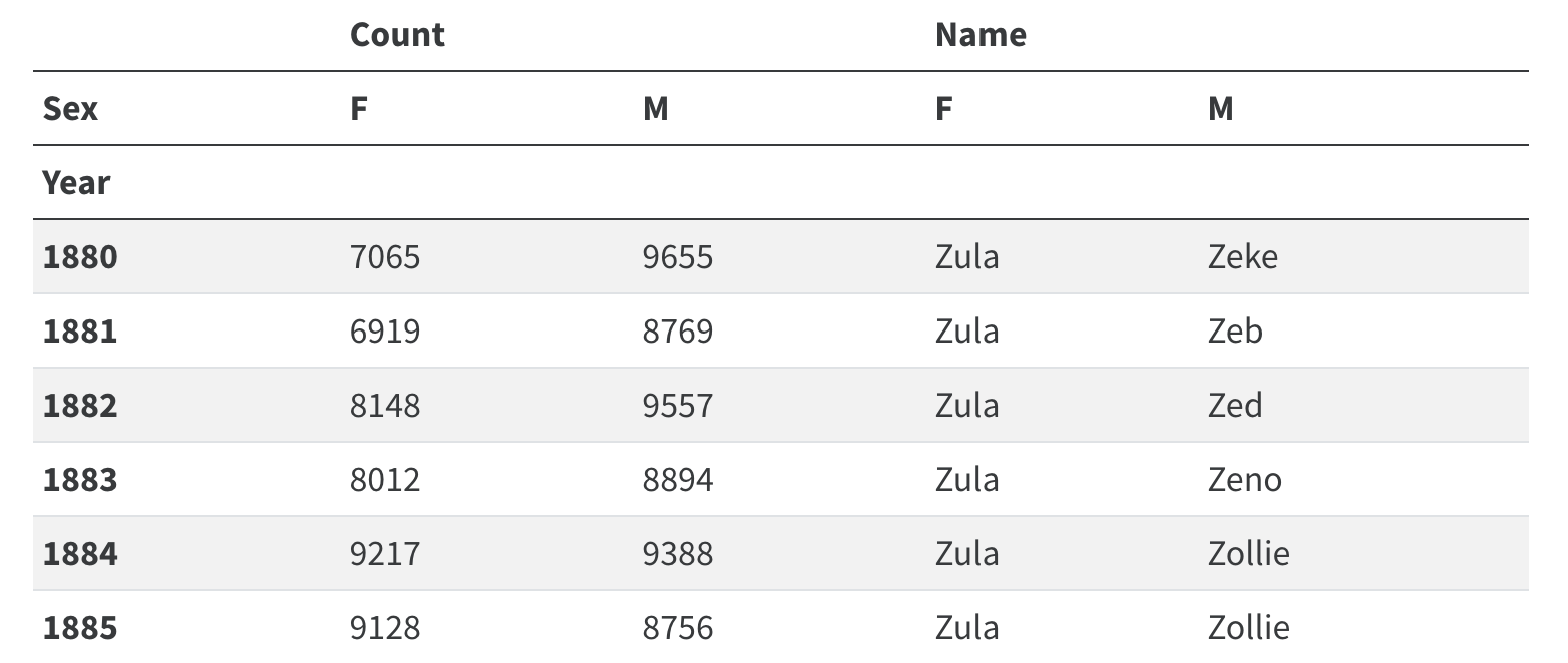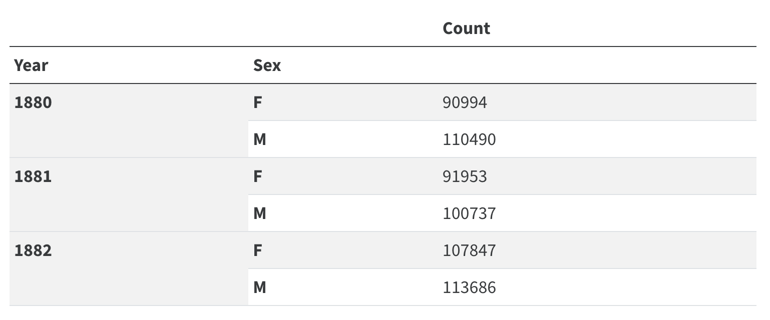 babynames.groupby(["Year", "Sex"])[["Count"]].agg(sum).head(6)