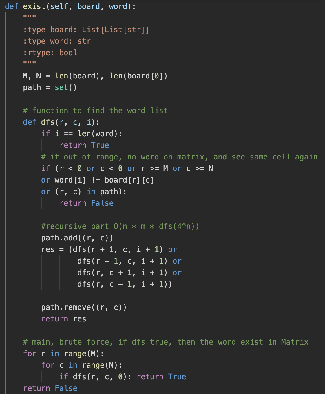 dfs suppose that if the count variable end with length of word, it is true there is a set of word in matrix.