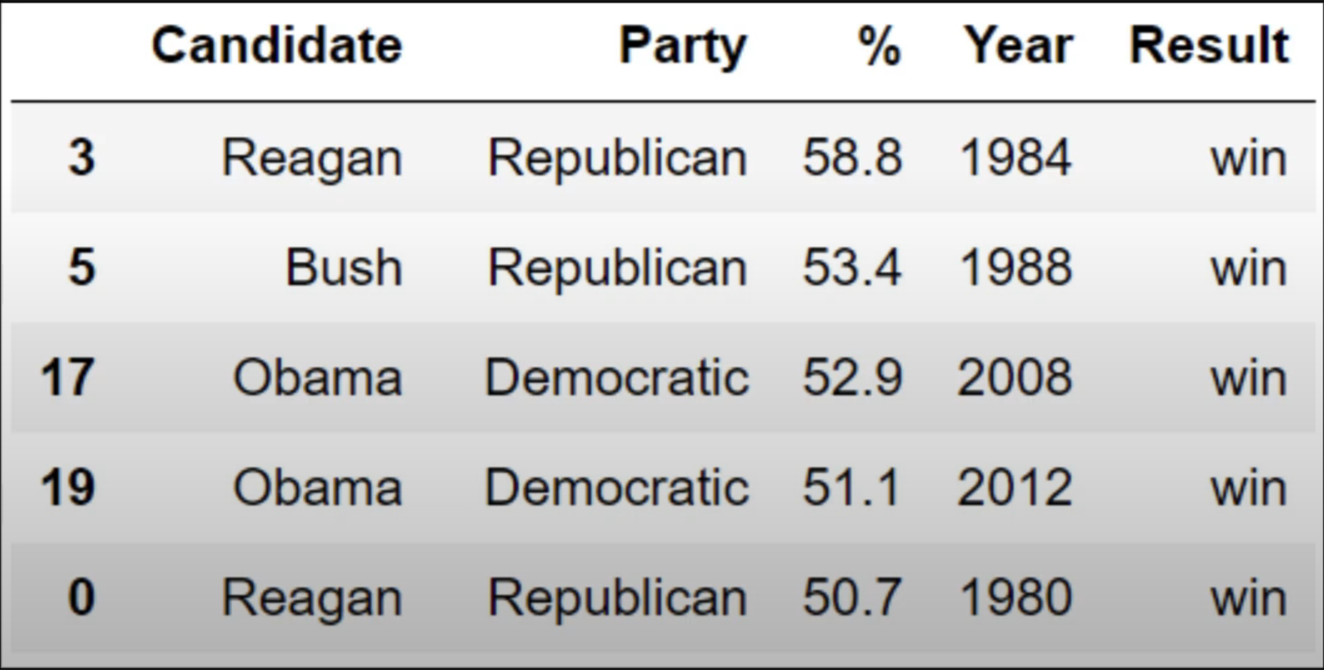 iswin = elections['Result'] == 'win'